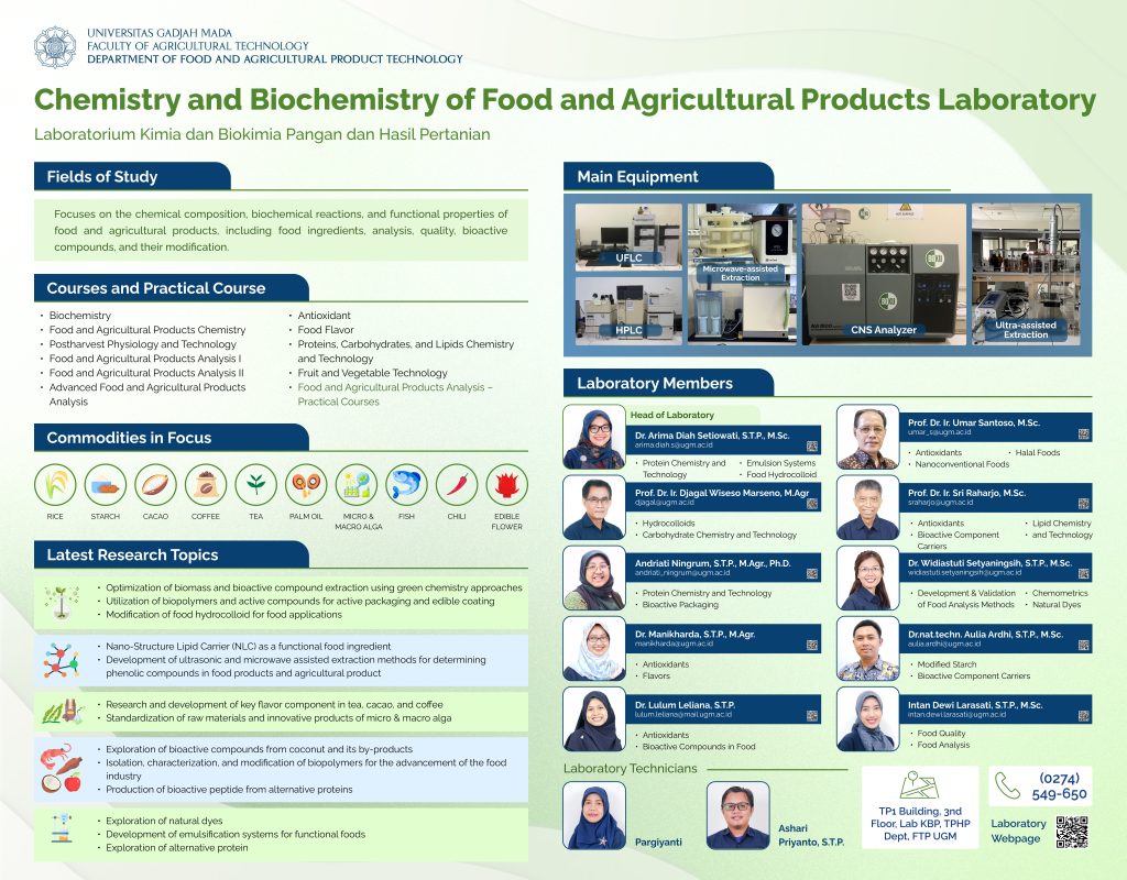 The Laboratory of Chemistry, Biochemistry and Agricultural Product is a laboratory in the Department of Food and Agricultural Product Technology that focuses on the development of sciences related to chemical aspects of foods and agricultural products such as chemical analysis, post-harvest physiology and technology, food additives, applied food chemistry and biochemistry, including evaluating the quality of food and other agricultural products from a chemical perspective.