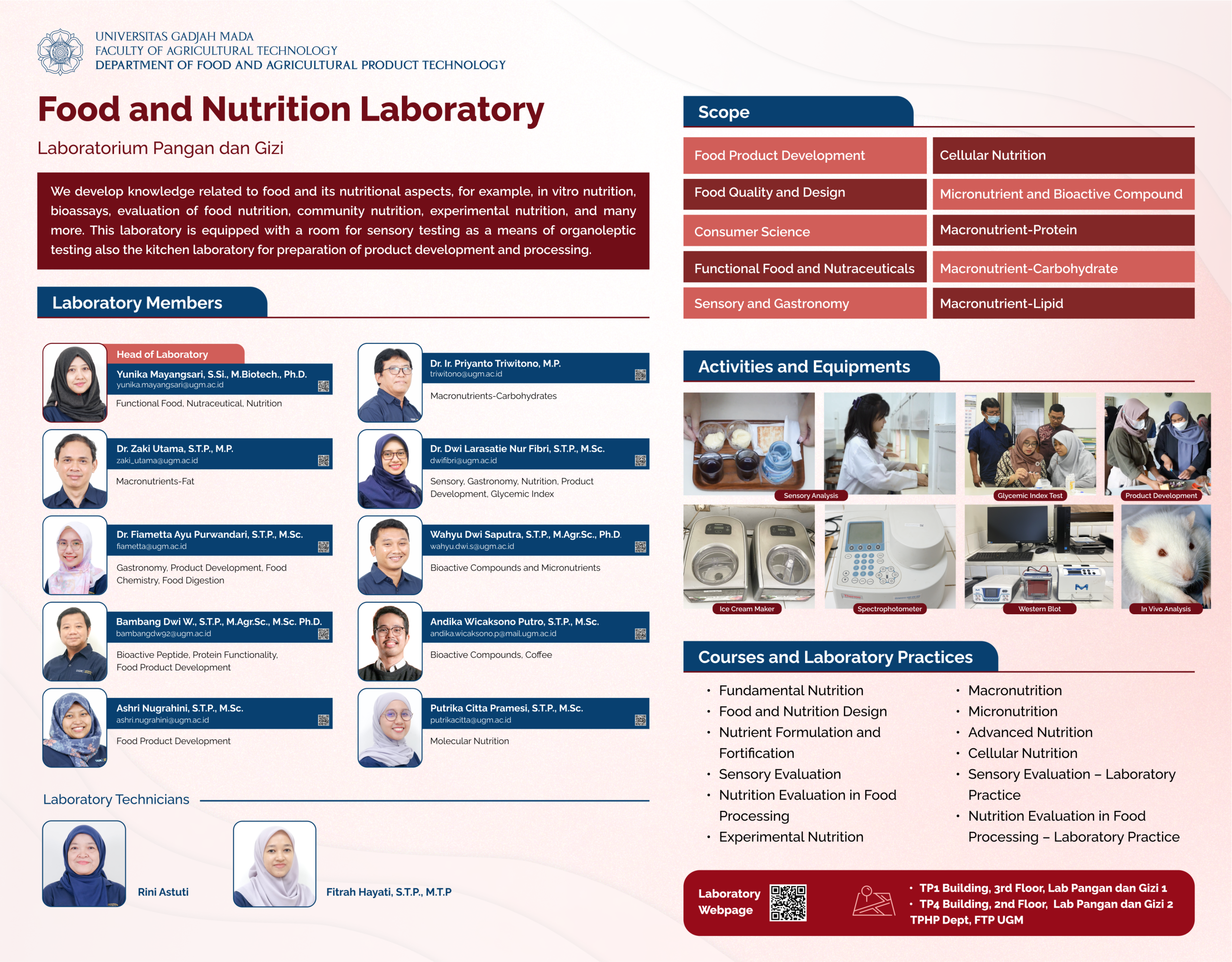The Food and Nutrition Laboratory is a laboratory in the Department of Food and Agricultural Product Technology to develop knowledge related to nutritional aspects, for example, in vitro nutrition, bioassays, evaluation of food nutrition, community nutrition, experimental nutrition, and many more. This laboratory is equipped with a room for sensory testing as a means of organoleptic testing also the kitchen lab, a laboratory for preparation of product development and processing.